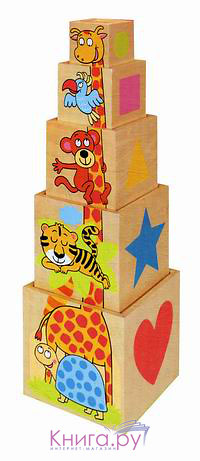 Пирамидка с животными Бино состоит из 20 элементов, яркие изображения несут не только эстетическое, но и развивающее значение.